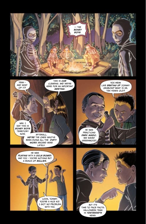Danny Baram: In the original Halloween Team volume, we learn about five misfit kids who, twenty years ago, banded together to solve mysteries and fight monsters in their small town of Greenwood, MA. In the present day, the team reunites – after many years apart – to solve a new mystery. But after finally getting back together, a very dark, shocking secret is revealed about the team’s past.In our new sequel series, Halloween Team: Shadows, we’re picking up right where we left off. The team has a new mission, and an urgent one, to save their long-lost friend who they now know is trapped in hell. But there’s now a lot of mistrust and tension on the team, and it’s unclear if they can work together to do what they need to do to save her. To make matters worse, we learn about new villains who have been pulling the strings since the events of Volume 1. And if they have their way, not only will the team’s friend remain trapped in hell, but Greenwood – and the entire world! – may soon be taken over by evil, nefarious forces. So can the team put aside their issues and save their friend, their town, and the world? Read Halloween Team: Shadows and find out!